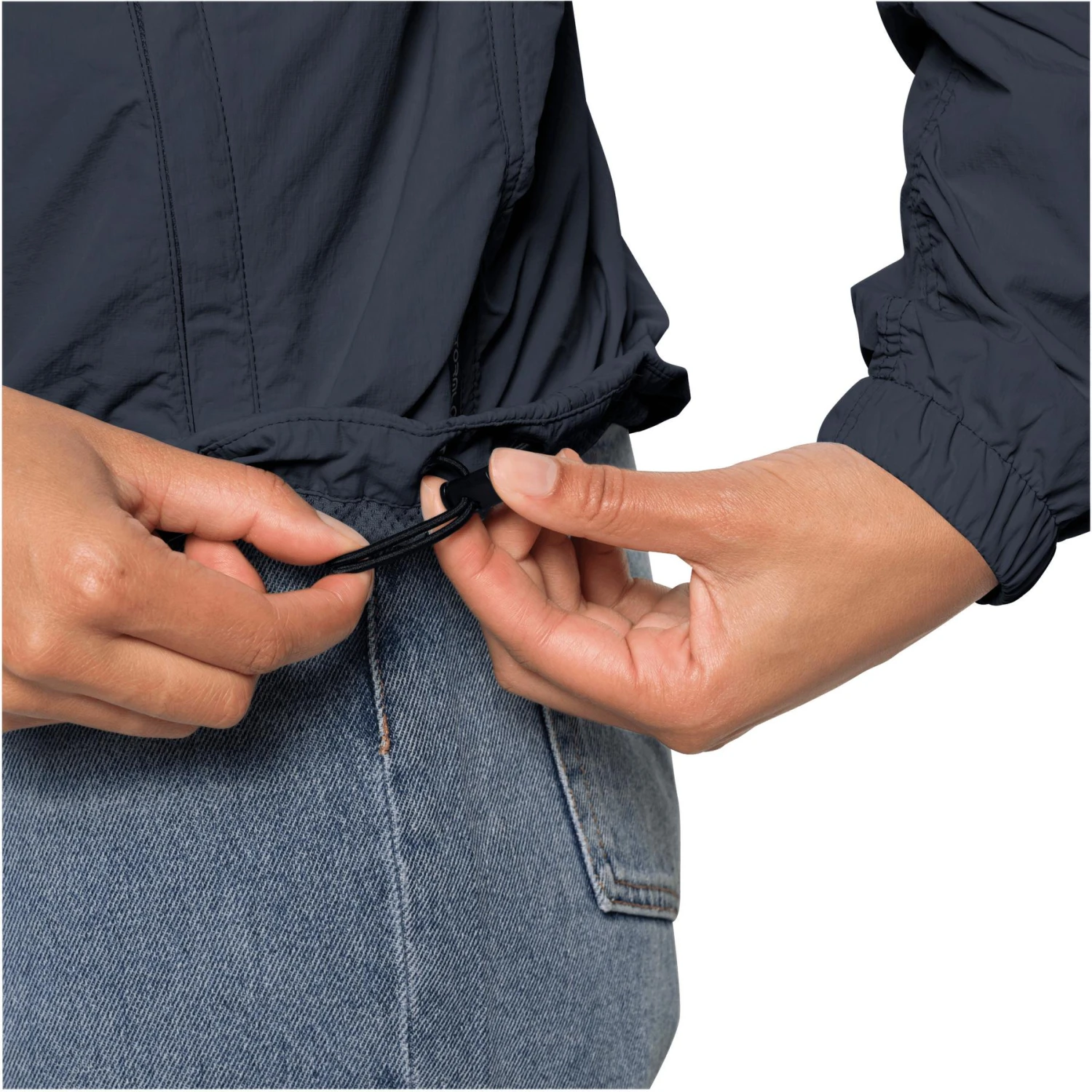 Windproof transitional jacket with moisture-regulating Mesh lining. Take a walk in the park or a shopping spree in London. Whatever your activity, there’s one thing you need for your spring outings: your LIGHTSOME JACKET. This lightweight transitional jacket is all about design and function! On the outside it is made of our recycled STORMLOCK ECOSPHERE material which is fully windproof and also protects against light showers. The interior of the LIGHTSOME JACKET is equipped with a recycled Mesh lining that makes the jacket even lighter and quickly wicks moisture away from the body. The ruched hem gives the jacket a more voluminous look, making it look great. STORMLOCK ECOSPHERE PAPERTOUCH CRINKLE: tough, lightweight, windproof and water repellent recycled polyamide fabric#VOLUME MESH ECOSPHERE Q.M.C.: bulky Mesh lining with thermal and moisture management properties made from reused plastic / LOGO LINING TAFFETA ECOSPHERE: recycled microfiber lining with printed logo#fixed hood with adjustable face opening#2 hip pockets, inside pocket#adjustable hem. transitional jacket#for leisure and travel#lightweight#windproof#with moisture management#with recycled materials#without PFCs# bluesign® certified#with “Grüner Knopf” label. 60#S#Recycled#Our model is 178cm tall and wears size S.#Lifestyle#Women’s windbreaker transitional jacket#Hood#No PFC#Leisure/Travel#Women. ZIP AND VELCRO CLOSURE#WASH ON REVERSE SIDE WITH SIMILAR COLORS#DRYERS NOT RECOMMENDED